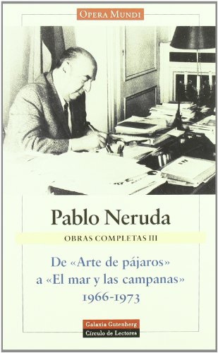 Este nuevo volumen de las Obras Completas de Pablo Neruda abarca la obra que va desde 1966 hasta su muerte en 1973, trayectoria marcada por los libros 'Arte de pájaros' hasta 'El mar y las campanas'. Herman Loyola, experto nerudiano, con la asesoría de Saúl Yurkievich, ha fijado la que se puede considerar la versión definitiva de los textos. Sinopsis Biografia Fragmento Enlaces Imágenes s
