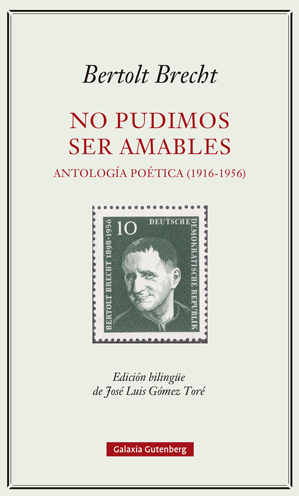 La poesía ocupa un lugar central en la obra de Bertolt Brecht (Augsburgo, 1898-Berlín Este, 1956) y sin ella no cabe entender el alcance ni la grandeza de su proyecto creativo. Brecht escribió poemas desde su juventud hasta sus últimos días y ellos fueron la herramienta con la que interpeló al mundo y reaccionó a las circunstancias de su tiempo. Figura clave en la literatura alemana del siglo xx, fue reconocido como un poeta esencial incluso por quienes se sintieron muy lejos de sus actitudes vitales y políticas, como Elias Canetti o Hannah Arendt. Su escritura, que bebe tanto de fuentes cultas como populares, anuncia no pocas direcciones de la lírica contemporánea: desde luego, la poesía social, pero también el realismo sucio, la lírica de tono coloquial o la llamada 'antipoesía'. Editada y traducida con maestría por el poeta José Luis Gómez Toré, esta antología bilingüe propone un recorrido no solo por los textos recogidos en libro por el autor, sino también por el riquísimo corpus de poemas sueltos, que incluye algunas de sus piezas más célebres. Tampoco faltan las letras de canciones para obras teatrales, musicadas por Kurt Weill o Hanns Eisler. s