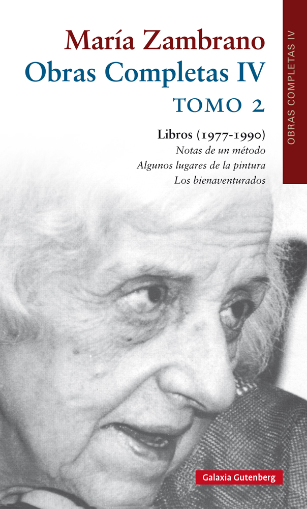 En sus respectivos tomos I y II, este vol. IV recoge los seis últimos libros de Zambrano con los que se completan los veintitrés que ella dio a publicar. Cuatro de ellos -Claros del bosque (1977), De la Aurora (1986), Notas de un método (1989) y Los bienaventurados (1990)- partieron de un tronco común, crecido entre 1954-1974, que desarrollará la razón poética, y del que se irán desgajando desde 1974, como ramas específicas suyas, estos cuatro libros, que configuran así el árbol final del pensamiento de Zambrano. Ese mismo tronco común afecta también a los otros dos libros que figuran en este vol. IV: Senderos (1986) y Algunos lugares de la pintura (1989). Este tomo II recoge Notas de un método, Algunos lugares de la pintura y Los bienaventurados. Notas de un método es correlativo a Claros del bosque, del que no se desgaja hasta 1974, y como él pertenece, según Zambrano, a la vía positiva, aquí desarrollada desde una perspectiva epistemológica y de crítica a la razón discursiva, cuyo eje son los tres caminos del pensamiento: el del deseo, el de la razón, y el de la visión mística. Los bienaventurados completa la vía negativa de De la Aurora, mostrando al bienaventurado como la figura de la posible perfección humana, alcanzada mediante el despojamiento del 'yo', y siendo la corona de la escala de la vida y de los seres y de toda una serie de categorías humanas (el filósofo, el poeta, el santo, el místico, el exiliado), camino del hombre verdadero. Todos los escritos sobre pintura recogidos en Algunos lugares de la pintura se orbitan en torno al componente auroral de este pensamiento. De los tres libros de este tomo II se ha realizado una completa edición crítica; y del mismo modo que en De la Aurora (tomo I de este vol. IV), en cada uno de ellos se ha añadido una serie de Apéndices con escritos inéditos de la pensadora conexionados con cada uno de ellos. s